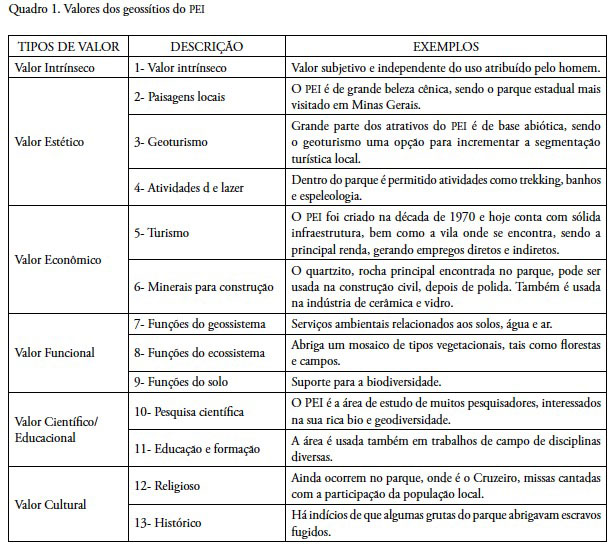 Para proceder à avaliação do patrimônio geológico desse parque, compreendido como o conjunto dos atrativos de base abiótica, uma vez que são dotados de algum tipo de valor (Quadro 1) foram realizados os seguintes procedimentos metodológicos, descritos a seguir.