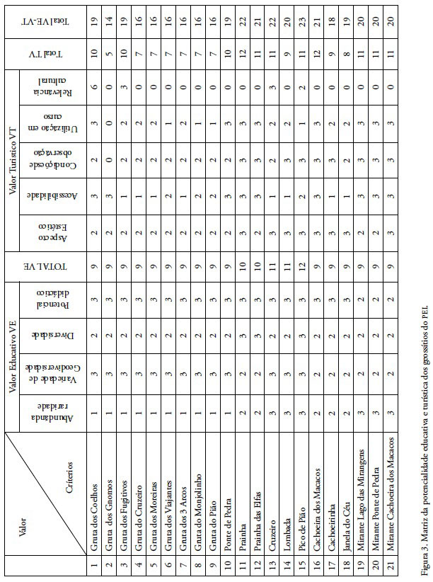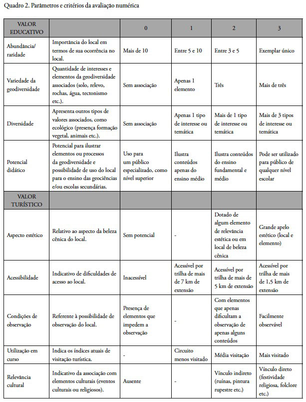 Com a inventariação chegou-se a número de 21 locais de interesse e partir dos mesmos procedeuse a escolha dos valores e critérios para compor a avaliação numérica dos geossítios do parque, todos com uma pontuação de 0 a 3 (Quadro 2). Essa avaliação foi baseada no trabalho de Lima (2008), já que o foco do trabalho é a identificação dos melhores locais para ocorrer a interpretação do patrimônio, sendo selecionados os valores educativo e turístico. Para cada valor foram elencados critérios que direcionassem para um local com potencial não apenas turístico como educativo, tendo como referência quatro eixos temáticos: grutas, praias fluviais, quedas d'água e locais panorâmicos. Apesar de na proposta original de Lima (2008), ter se quantificado o valor de degradação, optou-se em não utilizá-lo na avaliação numérica, pois através da inventariação se percebeu que, no momento, todos os geossítios inventariados apresentam baixa vulnerabilidade e, além disso, estão inseridos em um parque, o qual já apresenta programas de monitoramento para os geossítios e para as trilhas de acesso, sendo possível avaliar a degradação ao longo do tempo.