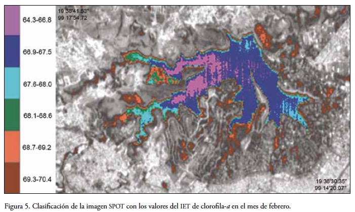 Combinando las ecuaciones 4 y 5 se generó la imagen IET del mes de febrero, clasificando los valores digitales del embalse a través del método de intervalos de densidad (Figura 5). Se observan valores de IET relativamente bajos hacia el noreste y sur de la presa, mientras que los valores más altos se ubican hacia el este del cuerpo de agua, lo cual es coincidente con los datos in situ, en particular con el punto 1, localizado al sureste. Si bien los valores digitales del IET satelital sobreestiman los medidos in situ, la tendencia es similar (Tabla 2).