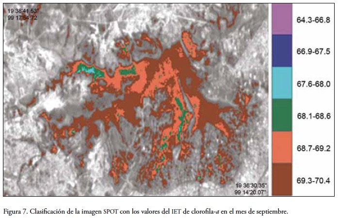 Combinando las ecuaciones 4 y 6 se generó la imagen IET correspondiente a septiembre. La tendencia lineal para esta fecha muestra una pendiente negativa indicando una relación inversamente proporcional entre las dos variables. Este comportamiento podría parecer contradictorio, sin embargo, una explicación posible es la presencia de pequeñas partículas de lirio acuático triturado y molido en esa época del año, generando una alta concentración de pigmento pero, al mismo tiempo, un mayor volumen de agua. Así, se tendría una gran cantidad de clorofila en la columna de agua pero la absorción del agua dominaría la señal en los valores digitales de satélite, a diferencia del muestreo de febrero donde la presencia de macrofitas (Eichhornia crassipes) dominaba la vegetación del embalse. Esta situación se refleja en la baja correlación entre los valores digitales de la banda 1 y la concentración de clorofilaa. Como en el caso previo, la figura se creó a partir de la clasificación de los valores digitales del IET de clorofila mediante intervalos de densidad (Figura 7). Se observa una tendencia hacia las clases con valores más altos, lo cual es coincidente con la hípereutrofización del embalse observada en esa época (Tabla 3).
