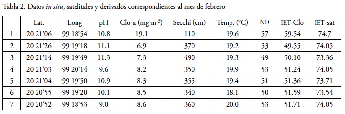 Datos satelitales. Se utilizaron dos imágenes multiespectrales SPOT correspondientes a las fechas del 12 de febrero y del 25 de septiembre de 2006, las cuales corresponden a fechas cercanas a los muestreos in situ, dado que no fue posible obtener imágenes simultáneas a éstos. Las imágenes fueron recortadas con centro en la zona en estudio, se les realizó una corrección atmosférica simple por corrimiento de histograma y fueron georreferidas mediante un conjunto de seis puntos de control y remuestreadas mediante el algoritmo de interpolación bicúbico (Mather, 1989). Se analizaron los valores digitales de cada banda por separado y del cociente entre las bandas 1 (verde) y 3 (infrarroja). Posteriormente, se realizó un análisis estadístico de correlación simple entre los valores digitales y los datos del logaritmo de los valores de la concentración de clorofilaa obtenidos en cada uno de los puntos de muestreo.
