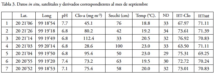 In September the concentration of chlorophyll a had a wide range of values with a mean of 72.90 (± 28.46) mg m3, which clearly indicates hypereutrophic waters. Secchi Transparency La averaged 60.29 (± 0.22) cm, with an Extinction Coefficient K = 2.82 m1. The TSI for this variable was 68.13 (± 5.32) indicative of hypereutrophized waters and suggesting anoxic hypolimnia. the TSI estimated from the concentration of chlorophyll a was 71.86 (± 4.62) which is a referent of hypereutrophized waters as well.