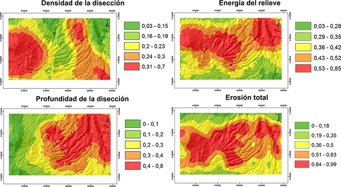Los métodos morfométricos utilizados se basan en los planteamientos de Simonov (1985), Lugo (1988) y Zamorano (1990). Se seleccionaron cuatro parámetros que representan la dinámica de laderas, derivados del modelo de elevación del terreno (MDT) y de la red fluvial. Las variables utilizadas son la densidad de la disección (D), la profundidad de la disección (P), la energía del relieve (E) y la erosión total (ET). La densidad de la disección (D) calcula la concentración de cauces fluviales en un área específica, tiene como objetivo establecer zonas de mayor o menor concentración de cursos fluviales y, por ende, con mayor erosión fluvial. Entre las variables que condicionan este parámetro morfométrico resaltan la competencia del sustrato, las estructuras disyuntivas (fracturas o fallas), la inclinación del terreno, la cobertura, así como la intensidad y el tipo de precipitación. Se determina trazando todos los cauces fluviales que hay en las cuencas dentro el área de estudio incluyendo los drenajes o torrentes de montaña que no aparecen en la cartografía. Posteriormente, se calcula la concentración de los ríos por unidad de área (unidad mínima de análisis: 500 m2 para este estudio debido a que las curvas de nivel a escala 1:10 000 permiten trabajar a esta resolución y obtener buenos resultados, pero podría variar dependiendo de la extensión de la cuenca e isohipsas). La profundidad de la disección (P) tiene como objetivo medir la capacidad o actividad erosiva de los ríos en la vertical, ya que analiza las superficies donde la erosión fluvial ha sido más (o menos) intensa a través del tiempo y proporciona una relación indirecta de los parámetros que permiten que la disección aumente como la litología, la inclinación del terreno, la precipitación y los planos de debilidad del sustrato. Se explica como la altura entre el talweg y la ruptura de pendiente más representativa y próxima a la ladera inferior del valle (por unidad espacial mínima de análisis) expresada en metros. La energía del relieve (E) determina la diferencia máxima de la altura relativa en metros en un área específica y representa la energía potencial que se desprende del relieve. Para su medición se ubicaron los valores de mayor y menor altitud, en este caso por unidad espacial mínima de análisis, y se obtiene la diferencia entre éstos. La erosión total (ET) determina zonas con mayor o menor erosión del relieve registrado por medio de la densidad de las curvas de nivel en un área determinada (por unidad espacial mínima de análisis).