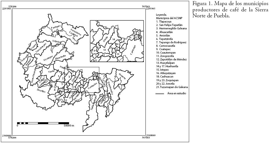 El estado de Puebla es el cuarto a nivel nacional, en cuanto a producción de café. En la Sierra Norte de Puebla el cultivo de café se encuentra entre los 300 y 1 400 msnm (Kraemer y Solórzano, 1990; Evangelista, 1999). El padrón cafetalero (SAGARPA, 2005) reporta una superficie de 61 460 ha cultivadas con café, en 548 localidades de 46 municipios del norte de Puebla (Figura 1). Los tipos de vegetación que hay son bosque tropical perennifolio, bosque mesófilo de montaña y vegetación riparia. Entre los 600 y 1 000 msnm hay una zona de ecocline entre los dos bosques (Martínez et al., 1995). Los climas que se presentan en el área en estudio son cálido húmedo con lluvias en verano Amw, semicálido húmedo con lluvias todo el año (A)C(fm) y semicálido con lluvias en verano (A)C(m), (Bermeo, 2003).