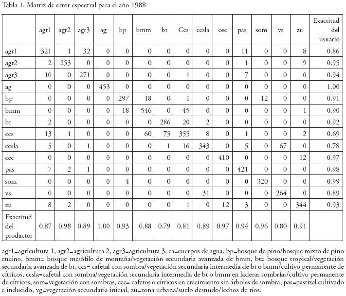 Se definió un polígono de 3 043 km2 en donde se encuentran 548 localidades productoras de café. Después de aplicar el algoritmo de máxima verosimilitud para la clasificación y hacer el cruzamiento entre el mapa obtenido y el mapa con los campos de entrenamiento para generar la matriz de error espectral, se obtuvo para la imagen de 1988 un 90.8% de exactitud total, 90.2% de exactitud del productor y 90.1% de exactitud del usuario, teniendo los porcentajes más bajos de exactitud del productor en la clase de bosque tropical (79%), la cual se confunde con el cafetal con sombra, y en vegetación secundaria con arbustos y árboles pequeños (80%), la cual se confunde con el cafetal con sombra en laderas asoleadas (Tabla 1).