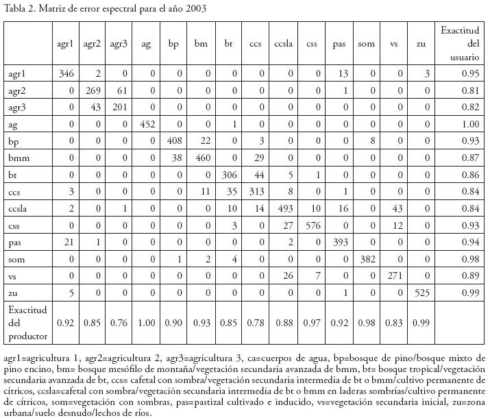 Para la imagen de 2003 se obtuvo un 90.8% de exactitud total, 90.0% de exactitud del productor y 84.4% de exactitud del usuario, con los porcentajes más bajos de error de omisión (exactitud de productor) en las clases agricultura 3 (76%), que se confunde con agricultura 2, y el cafetal con sombra (78%), que se confunde con el bosque tropical y con el bosque mesófilo (Tabla 2). Se debe tomar en cuenta que esta es sólo una medida que refleja la eficiencia de selección de los campos de entrenamiento utilizados para realizar la clasificación espectral supervisada (Muñoz y López, 2008).