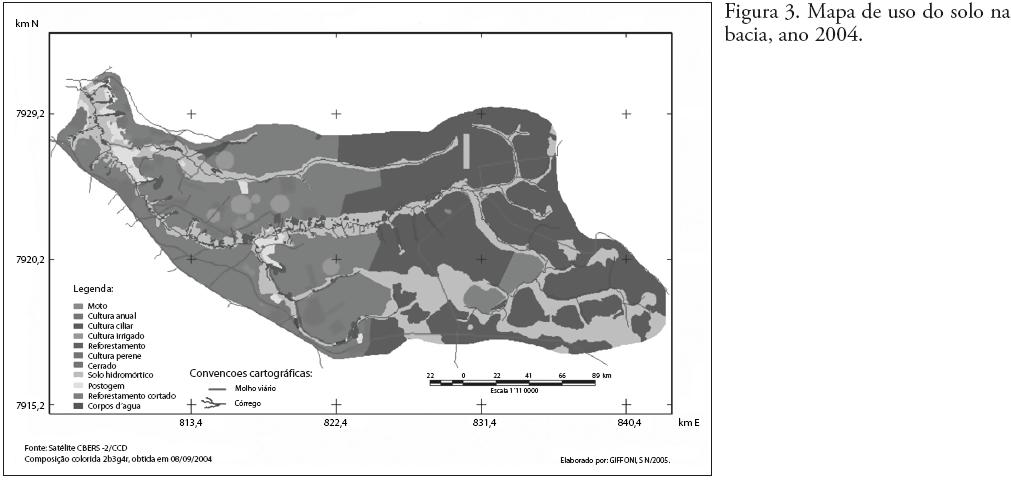 De acordo com Gifoni (2005), os mapas de uso do solo foram produzidos a partir de imagens do ano de 2002 (Figura 2) e 2004 (Figura 3), ñas quais foram encontradas as classes de: reforestamento, reforestamento cortado, cultura anual, cultura perene, cultura irrigada, pastagem, mata, mata ciliar, campo hidrófílo, corpos d'água e cerrado. Essas classes sofreram algumas modificações quanto à extensão, forma e quantidade, e não são perceptíveis apenas com a observação do mapa. Contudo, por meio de cálculos de área gerados no programa "spring 4.1" em hectares, foi possível tabular esses dados e gerar urna tabela (Tabela 1), para melhor expressar os resultados em porcentagem.