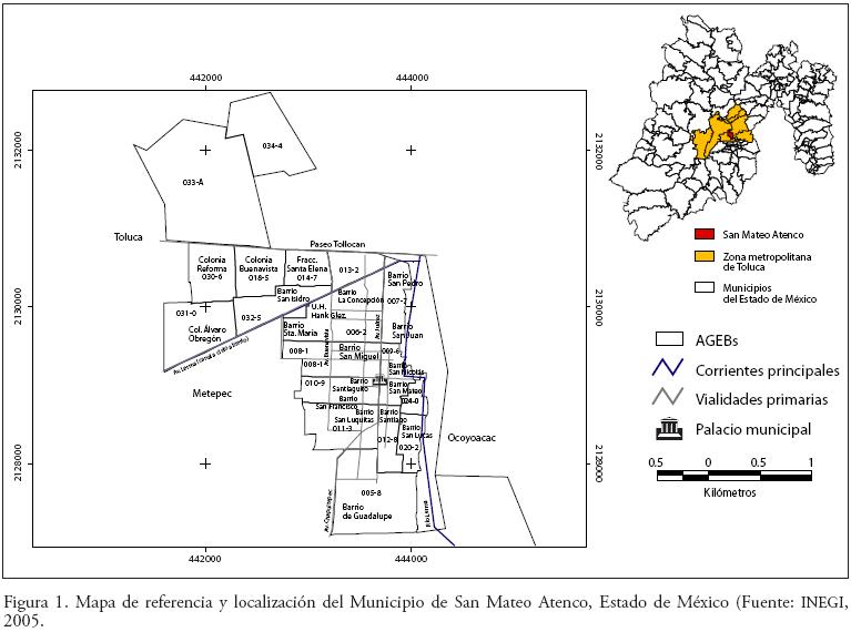 El municipio de San Mateo Atenco se localiza en la porción central del Estado de México, forma parte del área metropolitana de la Ciudad de Toluca. Colinda con los municipios de Toluca y Lerma al norte, Metepec al sur, Lerma al este y Ocoyoacac al oeste. Es un municipio de 63 356 personas (INEGI, 2006) que se distribuyen en 12 barrios, dos fraccionamientos, seis colonias y una unidad habitacional (Figura 1). Los barrios La Concepción, San Pedro, La Magdalena, San Juan, San Miguel, San Nicolás, San Francisco, Santiago y San Lucas, integran la cabecera municipal.