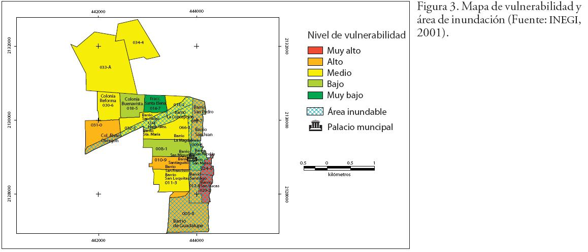 Se elaboró un mapa de vulnerabilidad a nivel de AGEB para distinguir la heterogeneidad del municipio en términos de vivienda, educación e ingresos. Se parte de la idea de que las condiciones socioeconómicas de la población se relacionan directamente con la distribución de los daños asociados a las inundaciones. Con base en estos mapas (Figuras 2 y 3) se seleccionaron las AGEBs en donde se aplicó una encuesta para conocer la opinión de los habitantes sobre las inundaciones y la actuación de las autoridades municipales al respecto.