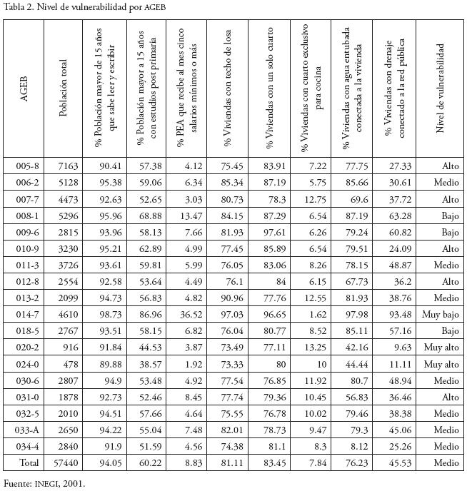 Es este caso, para determinar el nivel de vulnerabilidad se utilizó un indicador con base en la metodología propuesta por Zamorano et al. (1999), que retoma aspectos de las propuestas que asocian la vulnerabilidad con las condiciones socioeconómicas de la población. Con el indicador, obtenido por el método de componentes principales, se elaboró una tipología de las AGEBs (Tabla 2) cartografada en la Figura 3, que permite reconocer AGEBs con características socioeconómicas similares y clasificarlas.