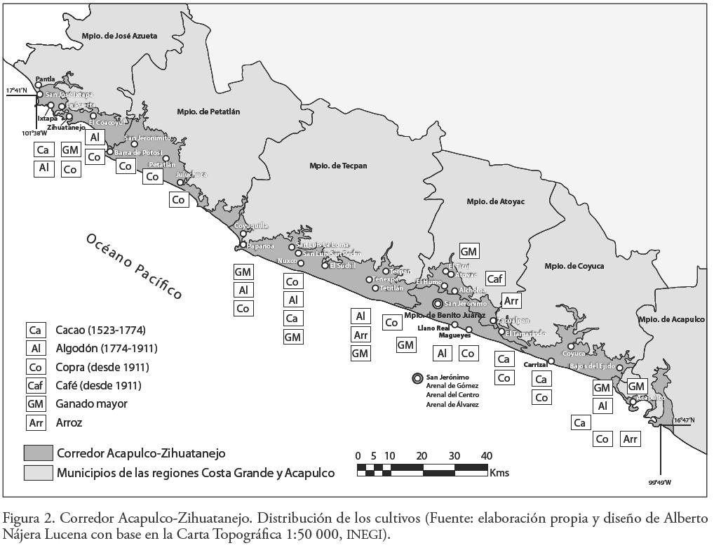 El Corredor AcapulcoZihuatanejo es la denominación con la que se conoce a la planicie costera comprendida entre estas dos ciudades del estado de Guerrero, una franja de tierra localizada en el litoral noroccidental del estado que resulta de capital interés para la inversión privada en megaproyectos turísticos. Este artículo describe los vaivenes históricos acaecidos en el uso del suelo con los ciclos de desarrollo y crisis en las prácticas productivas, y las consecuentes transformaciones culturales, por saltos sucesivos, en el paisaje de este territorio. Mediante un modelo de estudio de caso y los fundamentos de una geografía retrospectiva se elabora una indagación que permita comprender las condiciones en que se da la continuidad de una práctica productiva, o los determinantes que causan una ruptura en la misma práctica. Para este trabajo, el paisaje es una construcción históricocultural, el cultivo es el elemento de unidad del medio geográfico que participa de la formación del paisaje dentro de los sucesivos ciclos de producción, y la retrospectiva es una solución a las preguntas sobre el futuro, porque la observación del pasado sugiere el interrogante sobre el futuro, invita a abandonar la retrospectiva por la incertidumbre de la prospectiva.