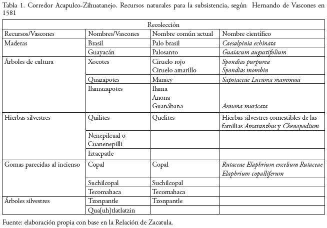 En la Relación de Zacatula se describe con acierto el clima, el relieve y los lugares geográficos. El clima (temperamento) se describe caliente y húmedo con lluvias de junio a septiembre. Según la relación, las lluvias se presentaban con viento del sureste. El "norte bravo ... causa destrucción de los frutos de la tierra." La mayor parte de la provincia "es serranía y tierra muy doblada". Describe el mar adentro como muy calmo y observa muy cerca de la costa "los navíos que vienen de las Islas del Poniente". Las mareas son pequeñas y en la costa es "mar que dicen de tumbo".2 Por el contrario, en el puerto de Zihuatanejo hay una "mareta3 pequeña",por el abrigo de las montañas que le rodean, en forma de herradura. Los caminos hacia Michoacán, dice, son torcidos, con grandes quebradas, difíciles hasta para caminar, y que requieren abrirse cada año. Luego cita a los pueblos que están "en llano", con su distancia al mar, entre otros datos. Da poca información sobre cultivos y plantaciones. La recolección era una práctica que contribuía en forma significativa para la alimentación (Tabla 1).