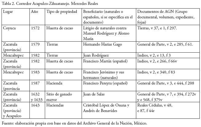 Luego de la caída demográfica, la concentración de los pueblos indios en congregaciones liberó tierras para la Corona y para los colonizadores. En los centros de población se clasificaban las tierras según su uso: los solares para la construcción de casas, las huertas para cultivos de plantaciones y, fuera de la influencia del área más poblada, las tierras de cultivo, los sitios de ganado mayor, las pasturas, los bosques. En la Tabla 2 se incluyen datos de las Mercedes Reales otorgadas en el periodo, recolectados de documentos primarios. Las mercedes de "Huertas de cacao" hacen referencia a unidades que estaban en producción desde épocas anteriores a la presencia española en la región, con técnicas que se mantuvieron constantes durante todo el tiempo que duró la reproducción del cacao.