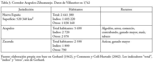 En los albores del siglo XVIII disminuye significativamente la reproducción ampliada del cacao en la región y sus vínculos con el mercado exportador, aunque las huertas seguirán produciendo para el centro del país y el consumo local. Sin embargo, la disminución en la gran producción implicó transformaciones importantes en las costas, sobre todo en las jurisdicciones de Zacatula y Coyuca, debido al abandono de las haciendas.4 En la década de los años cuarenta del siglo XVIII, José Antonio de Villaseñor y Sánchez realiza un trabajo de recolección de datos regionales de Nueva España, como respuesta a las instrucciones giradas por la Corona a todas las jerarquías civiles, desde el virrey hasta los alcaldes mayores para el registro "del verdadero estado de aquellas provincias".5 El informe es una descripción esquemática de las distintas jurisdicciones, dando preferencia a las condiciones de la población, las aptitudes territoriales, el desarrollo de la producción y la existencia de recursos naturales en función de su aprovechamiento (Commons y CollHurtado, 2002:10). Para las jurisdicciones de Acapulco y Zacatula se estiman las siguientes cifras, tomando la referencia de las cifras totales de Nueva España (Gerhard, 1962).
