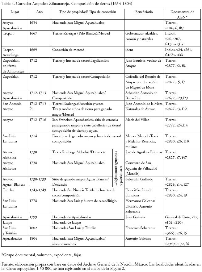 La Tabla 4 se elabora con el fin de mostrar en forma ordenada la composición de tierras desde las primeras ventas hechas por la Corona. La Tabla 5 ordena los datos de un único documento del año 1716, un informe al rey de las unidades productivas existentes en la región. Es un informe girado a la Corona, solicitado por encargo del propio rey, Felipe V, a la Audiencia de México, que tiene el propósito de registrar las propiedades para la recaudación fiscal.