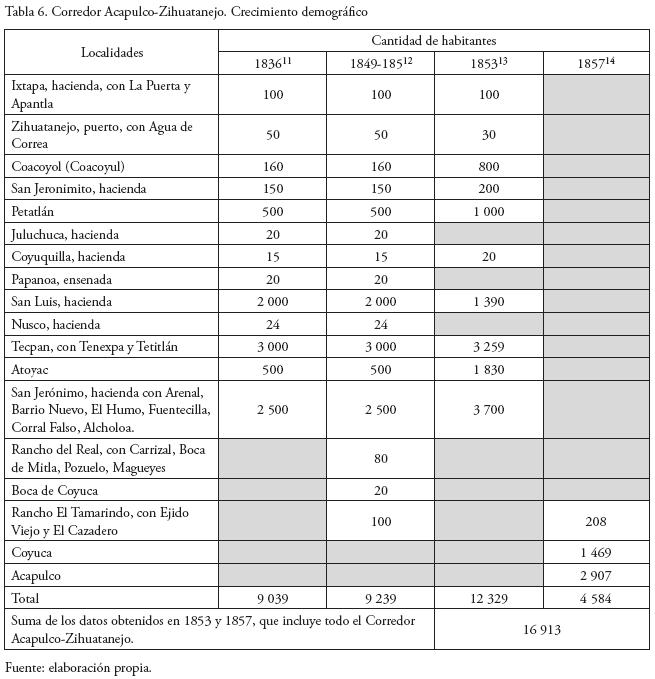 En 1742 Villaseñor y Sánchez atribuye 2 590 habitantes a la jurisdicción de Zacatula. Esta región se extendía desde el borde del mar hasta el flo de la Sierra Madre del Sur, y hacia el poniente desde el río Coyuca hasta los límites con Michoacán, donde Zacatula incluía el área de Motines, más de 15 000 km2. De todos modos, el área de mayor población estaba localizada en la zona costera, de menos de 2 000 km2. Comparando el incremento entre 1742 y 1836 (Pavía, 2000:493n),7 (9 039 habitantes) con el incremento entre 1836 y 1853 (Ibid.:493),8 (13 000 habitantes) se puede estimar un incremento del 1% anual en los 94 años del primer periodo y un 7% anual en los 15 años del segundo periodo (Tabla 6). Teniendo en cuenta las limitaciones en cuanto a la precisión de los datos que se observan en las líneas anteriores, es probable que el valor del incremento fuera mayor en el área del Corredor AcapulcoZihuatanejo. Por otra parte, sumando las cantidades disponibles en 1853 y 1857 (Ibid.:492)9 se puede estimar una cantidad de 16 913 habitantes para el total del Corredor, de 1 832.4 km2 en 1857, aproximadamente 9 hab/km2. Pavía Miller estima para la misma fecha 36 000 habitantes para el total de municipios de la actual región Costa Grande, de 14 760.7 km2, 2.44 hab/km2. Estas estimaciones evidencian una densificación poblacional progresiva del área del Corredor AcapulcoZihuatanejo, en consonancia con la ampliación de la superficie agrícola destinada a las plantaciones de algodón, la cual acusa una expansión significativa en 1861 con el impulso dado por la guerra civil de Estados Unidos, acontecimiento que inhibió su propia producción.