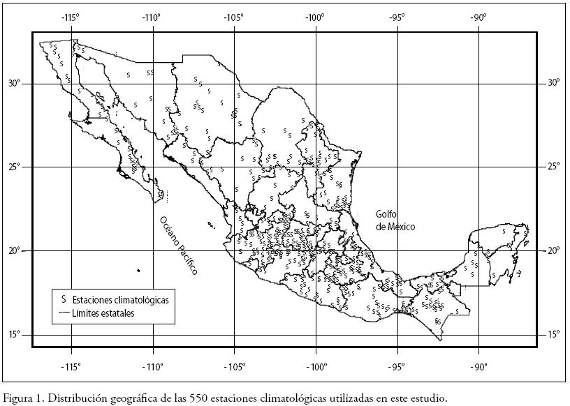 Datos diarios de precipitación y temperatura de más de 5 000 estaciones climatológicas fueron proporcionados por el Servicio Meteorológico Nacional Mexicano (SMN), variando desde 1900 hasta el 2008. Los datos fueron evaluados aplicando criterios de calidad como se ha sugerido en estudios climáticos (Alexander et al., 2006; IPCC, 2007). Un total de 550 estaciones climatológicas (ec) distribuidas razonablemente en todo el país (Figura 1) fueron seleccionadas, mismas que cumplieron criterios como: longitud de registro ≥50 años, que tuvieran más del 80% de la información, consistencia anual e interanual y homogeneidad de las series. Estaciones con registros de 40 años fueron consideradas para cubrir espacios geográficos del área en estudio (menos del 2% de ellas).