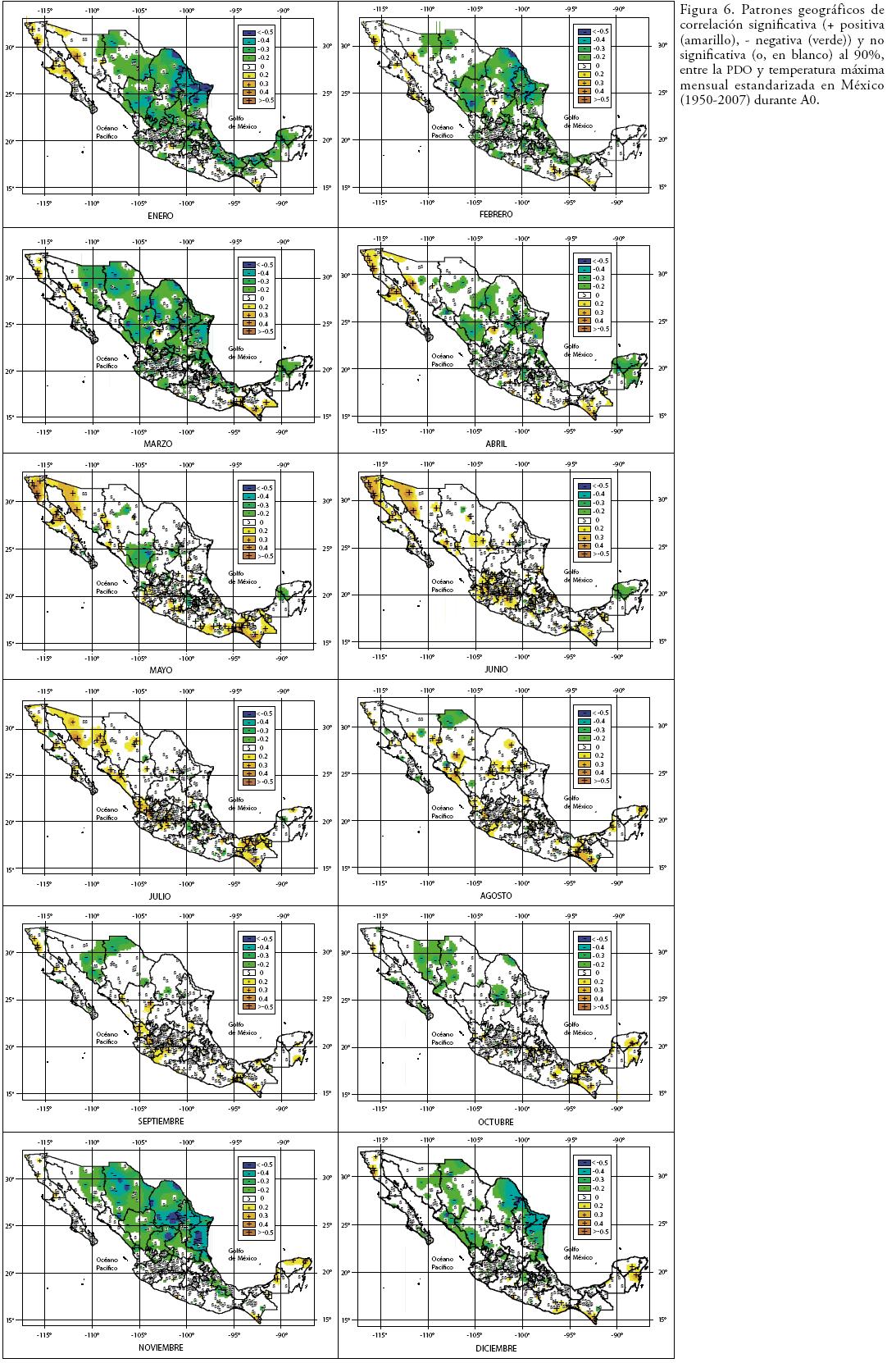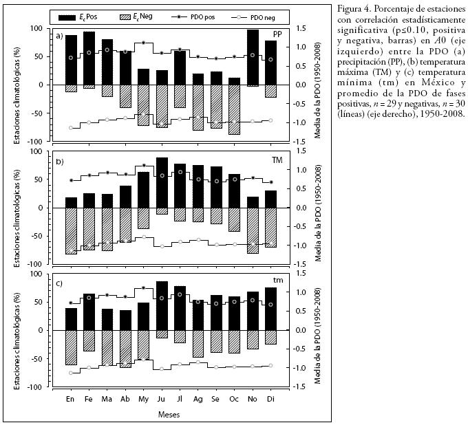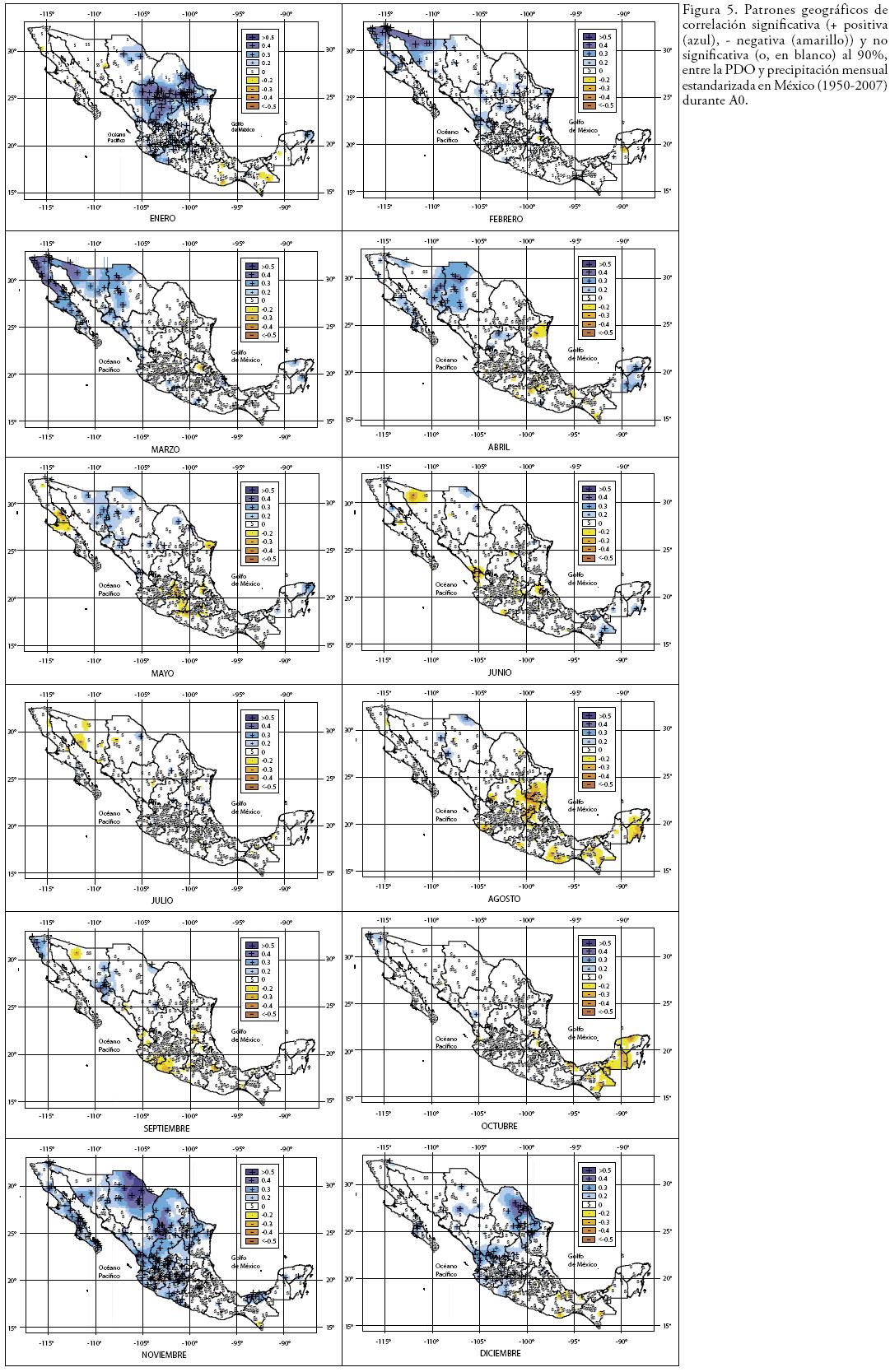 Los patrones geográficos de correlación de PDOtm de este estudio, son afines a lo documentado por Pavia et al. (2006) en temperatura media durante verano, pero también a lo documentado por Cavazos y Hastenrath (1990) usando el Índice de la Oscilación del Sur. Englehart y Douglas (2002) han documentado que las teleconexiones más fuertes (PPmodas climáticas) ocurren en la fase positiva de la PDO, mismas que son responsables de eventos extremos de precipitación en el sur de México (Peralta et al., 2009).