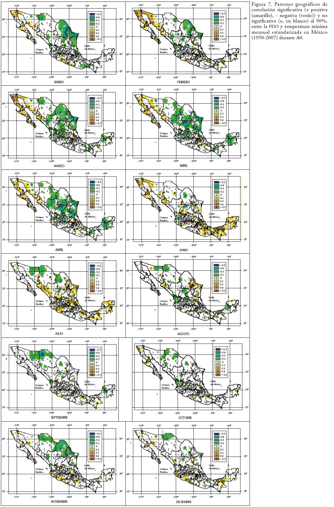 Los patrones de correlación (positivos/negativos) para tm no muestran patrones claros y se reparten casi uniformemente durante el año (Figura 4c). Las correlaciones positivas más importantes detectadas entre la PDOtm se registran sobre el centro y sur del territorio mexicano durante junio y julio, y noroeste de México desde enero a junio (Figura 7), representando ascenso (descenso) de temperatura mínima con la presencia de valores positivos (negativos) de la PDO (Figura 4c). Las correlaciones negativas PDOtm se distribuyen ampliamente sobre el noreste de México, favoreciendo temperaturas mínimas por arriba de lo normal (por abajo) desde enero a mayo (Figura 7) durante la fase negativa (positiva) de la PDO.