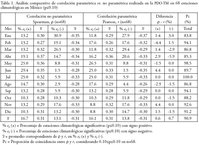 Una muestra aleatoria (n=68), que representa 12.3% del total de ec en TM, fue analizada con correlación paramétrica (r) desde enero a diciembre en A0, para comparar y confirmar las teleconexiones evaluadas en este estudio con ρ (correlación no paramétrica). Los resultados indican que el porcentaje promedio de estaciones climatológicas con correlación significativa positiva (p≤0.10) en PDOTM usando ρ y r son similares (16.7% y 16.1%), al igual que en las correlaciones negativas (13.1% y 13.8%) en ρ y r, respectivamente (Tabla 1).