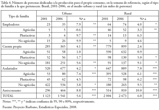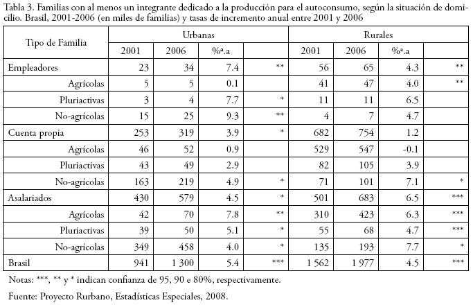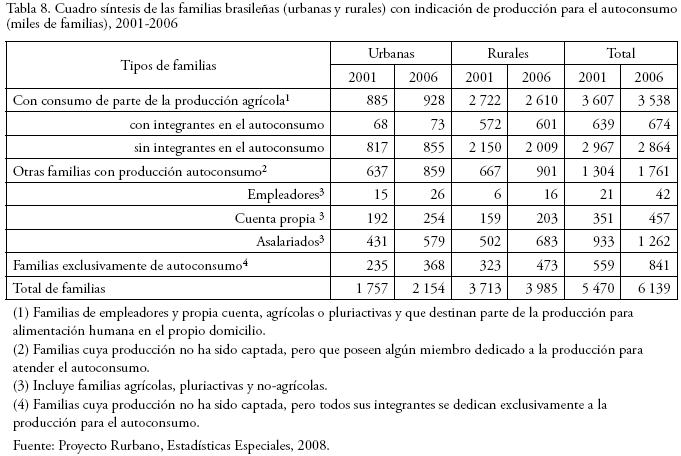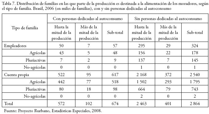 En efecto, se observa que según esa fuente en 2006 había en Brasil 2.86 millones de familias sin ningún miembro dedicado en exclusivo a la producción de autoconsumo, aunque parte de su producción global fue destinada a la atención de las necesidades alimentarias de la familia, es decir, domicilios en los que sus miembros están ocupados en otras actividades, siendo la actividad de autoconsumo una labor de carácter secundario. Este colectivo hasta entonces no había sido captado, siendo que 2.54 millones (88.7%) corresponden a familias por cuenta propia y 324 mil (11.3%) son de empleadores. Es menester destacar las 401 mil familias que a pesar de no contar con ningún miembro dedicado en exclusivo a la producción de autoconsumo, destinan más de la mitad de su propia producción agroganadera al objetivo de alimentar a la familia.